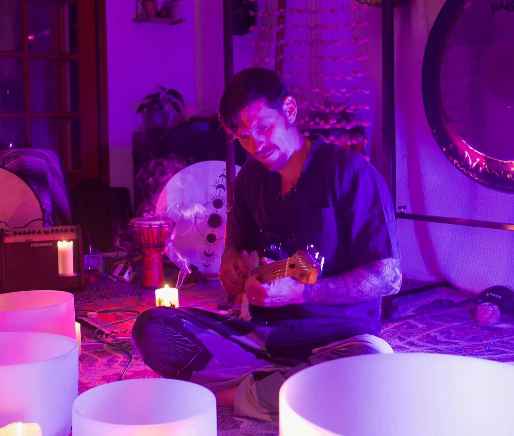 I use instruments such as crystal bowls, gong, chimes, drums, guitar, didgeridoo and hand pan. I also like to use synth and natural field recordings to help create atmosphere.